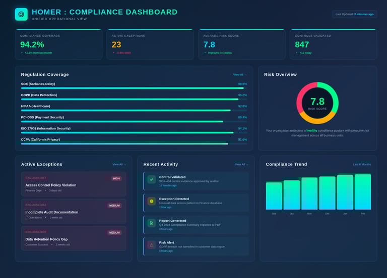 Homer operates a continuous, agent-driven compliance intelligence system.